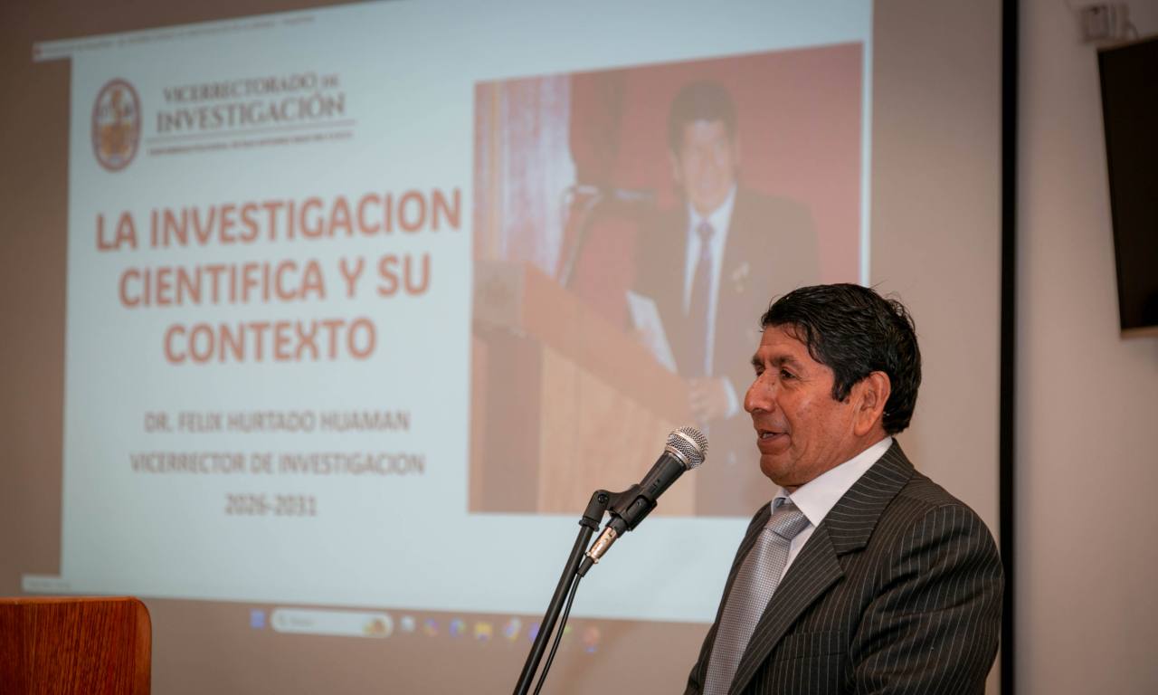El Dr. Félix Hurtado Huamán, Vicerrector de Investigación, expuso sobre "La Investigación Científica y su Contexto", ofreciendo un panorama integral sobre el rol de la universidad en la producción del conocimiento científico y su vínculo con las necesidades del entorno regional. Por su parte, el Dr. Alfredo Valencia Toledo, Director del Consejo de Unidades de Investigación (CUI), precisó que una línea de investigación, conforme a los criterios de CONCYTEC, no es un proyecto aislado, sino una sucesión continua y ordenadora de actividades científicas — articulando tesis, artículos, laboratorios y proyectos en torno a un eje-problema temático común.